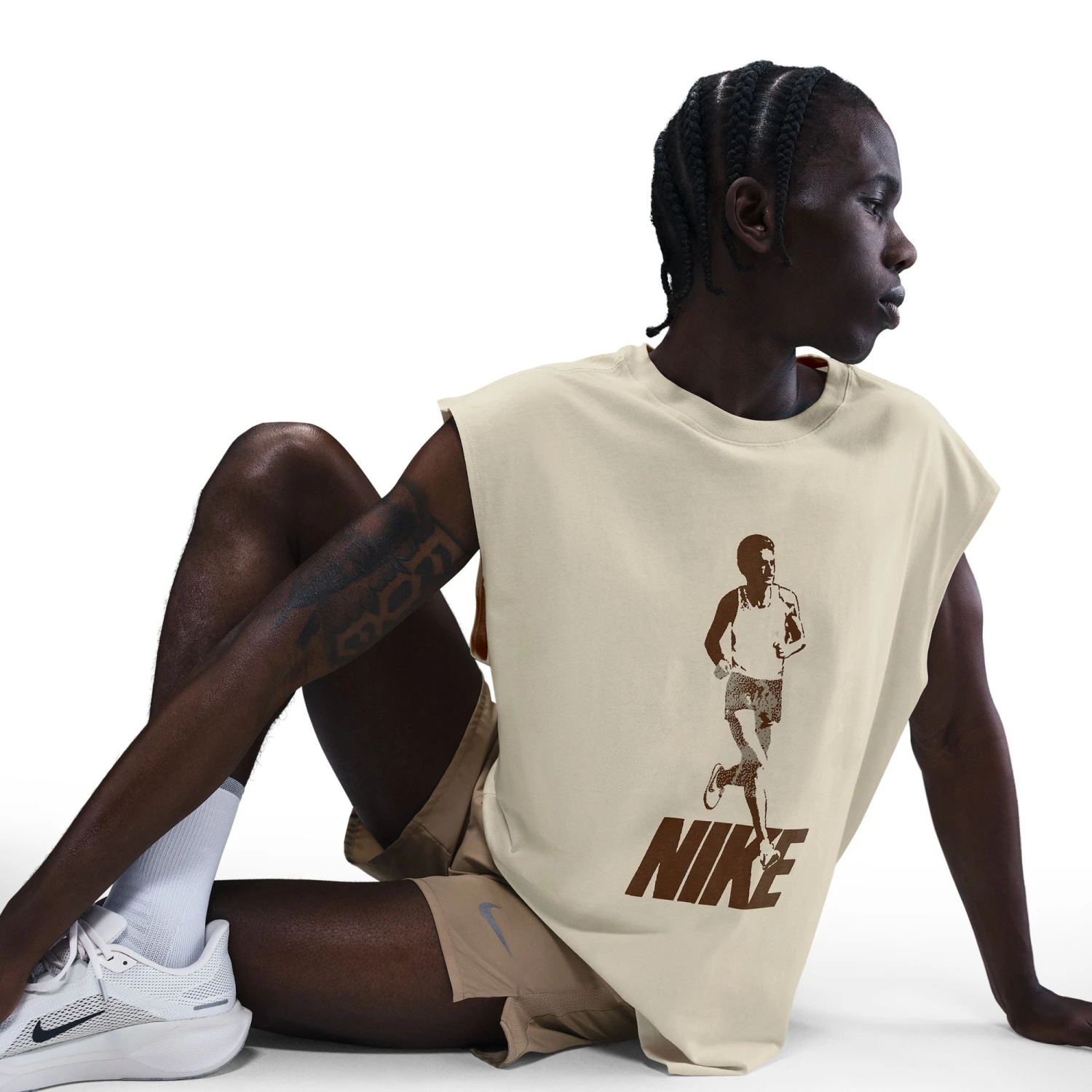 Embrace your pace in this sleeveless graphic tee. Its loose fit gives you a roomy feel and the midweight cotton fabric feels soft and comfortable.